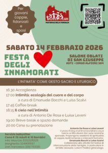 - un pomeriggio con un momento formativo sul tema “L’intimità come gesto sacro e liturgico”, guidato da due coppie speciali: Emanuele Bocchi e Luisa Salvi di Intercomunione e Antonio e Luisa De Rosa curatori del blog matrimoniocristiano.org.